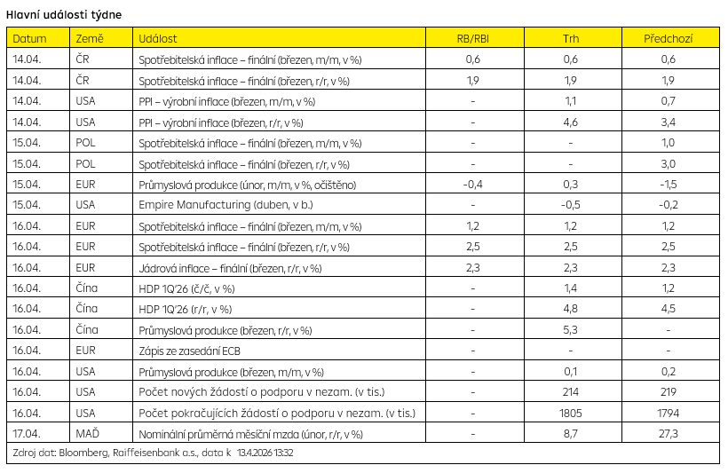 - Ačkoli ekonomický kalendář minulého týdne byl nabitý, data byla opět v ústraní. Nejdůležitějším údajem z tuzemska byla březnová inflace (1,9 %), která (prozatím) skončila pod odhady i cílem ČNB. Očekávání finančních trhů na další postup měnové politiky ČNB se však v tu chvíli nezměnila. Ta zřetelně poklesla až po dosažení dočasného příměří na Blízkém východě.