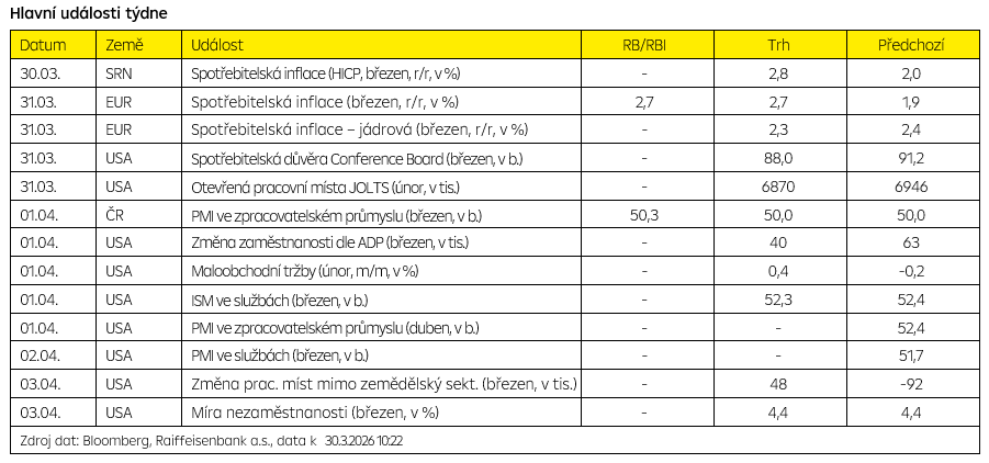 - ČNB: Bankovní rada drží základní úrokovou sazbu na 3,50 % již od loňského května. Válka na Blízkém východě způsobuje velkou míru nejistoty a proto předpokládáme, že bankovní rada zaujme vyčkávací postoj a očekáváme stabilitu úrokových sazeb po celý letošní rok bez ohledu na to, zda nastane jeden nebo druhý scénář. Před úrokovými sazbami by bankovní rada dala přednost využití objemných devizových rezerv.