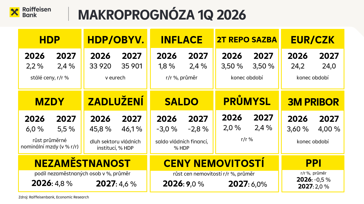 V případě brzkého uklidnění konfliktu by si česká ekonomika udržela růst okolo 2 % a inflace by se po odeznění cenové vlny vrátila do blízkosti 2 %. Celou prognózu najdete zde.