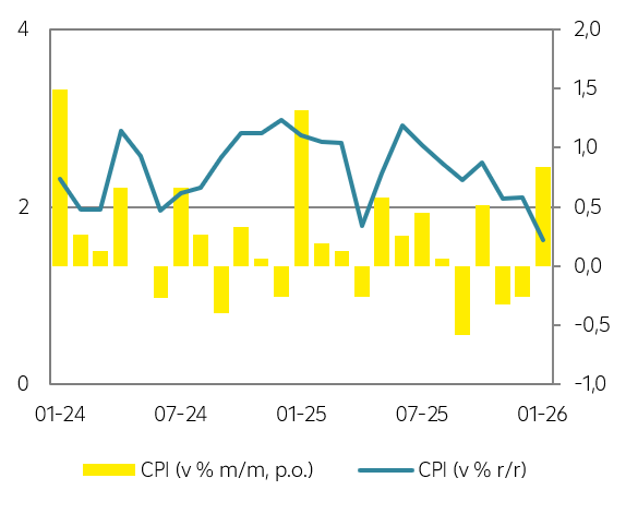Lednová inflace nastavila inflační trajektorii pro celý letošní rok. Očekáváme, že se inflace bude pohybovat v některých měsících pod 2 %, v některých měsících nad touto hranicí, mimo jiné v závislosti na srovnávací základně. V průměru by inflace měla poklesnout z loňských 2,5 % ke 2 %. Nicméně značnou roli v tom sehrává odpuštění POZE, ale tento efekt v příštím roce vyprchá, a inflace opět mírně vzroste. ČNB tak podle nás i přes aktuální příznivý inflační vývoj nepřistoupí ke snižování úrokových sazeb. Nastavení měnové politiky by totiž mělo ovlivňovat ekonomiku v horizontu 12-18 měsíců, přičemž my vnímáme proinflační rizika plynoucí ze struktury české ekonomiky (trh práce, trh nemovitostí) a pokračující růst cen ve službách, cen bydlení, efekt zavedení EU ETS 2 od roku 2028 a také pravděpodobně uvolněnější fiskální politikou, na kterou současná bankovní rada poukazovala jako proinflační riziko už v předchozích letech. Naším základním scénářem tak v tuto chvíli zůstává stabilita po celý letošní rok, přičemž rizika naší predikce jsou vychýlena směrem k nižším sazbám.