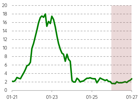 Pro ČNB ovšem bude klíčová zpráva, že ceny služeb meziročně zdražily stejně jako v prosinci o 4,7 %. Jádrová inflace i přes mírný meziroční pokles cen zboží zůstane zvýšená, což by podle nás měl být hlavní důvod, proč by ČNB měla ponechat sazby nezměněny. Koruna vnímá, že se snížilo riziko uvolnění měnové politiky na odpoledním zasedání ČNB a posílila o 0,2 % k 24,32 EUR/CZK.
