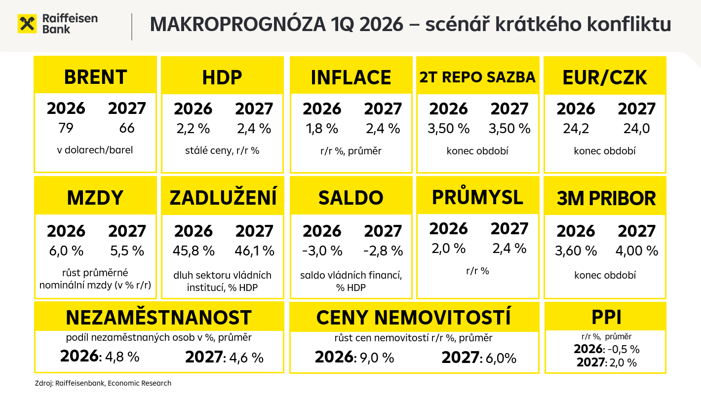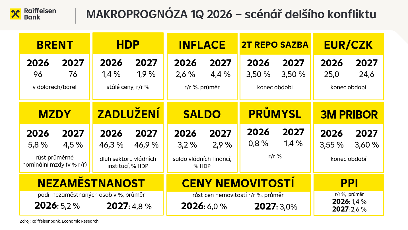 Válka na Blízkém východě je hlavní riziko pro světovou ekonomiku a scénáře závisí na její délce: rychlé uklidnění nebo několik měsíců konfliktu. V nejistém scénáři by ropa mohla vzrůst na 150–170 USD/barel a eurozónu čeká stagflace; ECB by mohla reagovat vyššími sazbami, Fed by se v případě rychlého ukončení vrátil k uvolněnění. Česká ekonomika čelí vyšší nezaměstnanosti a možnému omezení růstu, inflace by při vleklém napětí mohla šplhat až na 6–7 %, koruna oslabil by k 25 EUR/CZK.
