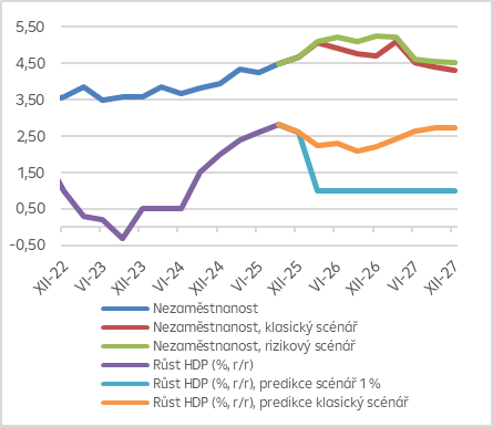 Česká ekonomika by měla i přes nepříznivé vnější vlivy růst, avšak pomaleji. V základním scénáři se očekává růst kolem 2,2 %, v případě delšího konfliktu zpomalení k 1,4 %. Negativní dopady by se projevily především skrze dražší energie, slabší zahraniční poptávku a opatrnější chování domácností i firem. Průmysl nadále čelí slabší poptávce, zejména z Německa, a jeho výhled zůstává nejistý.